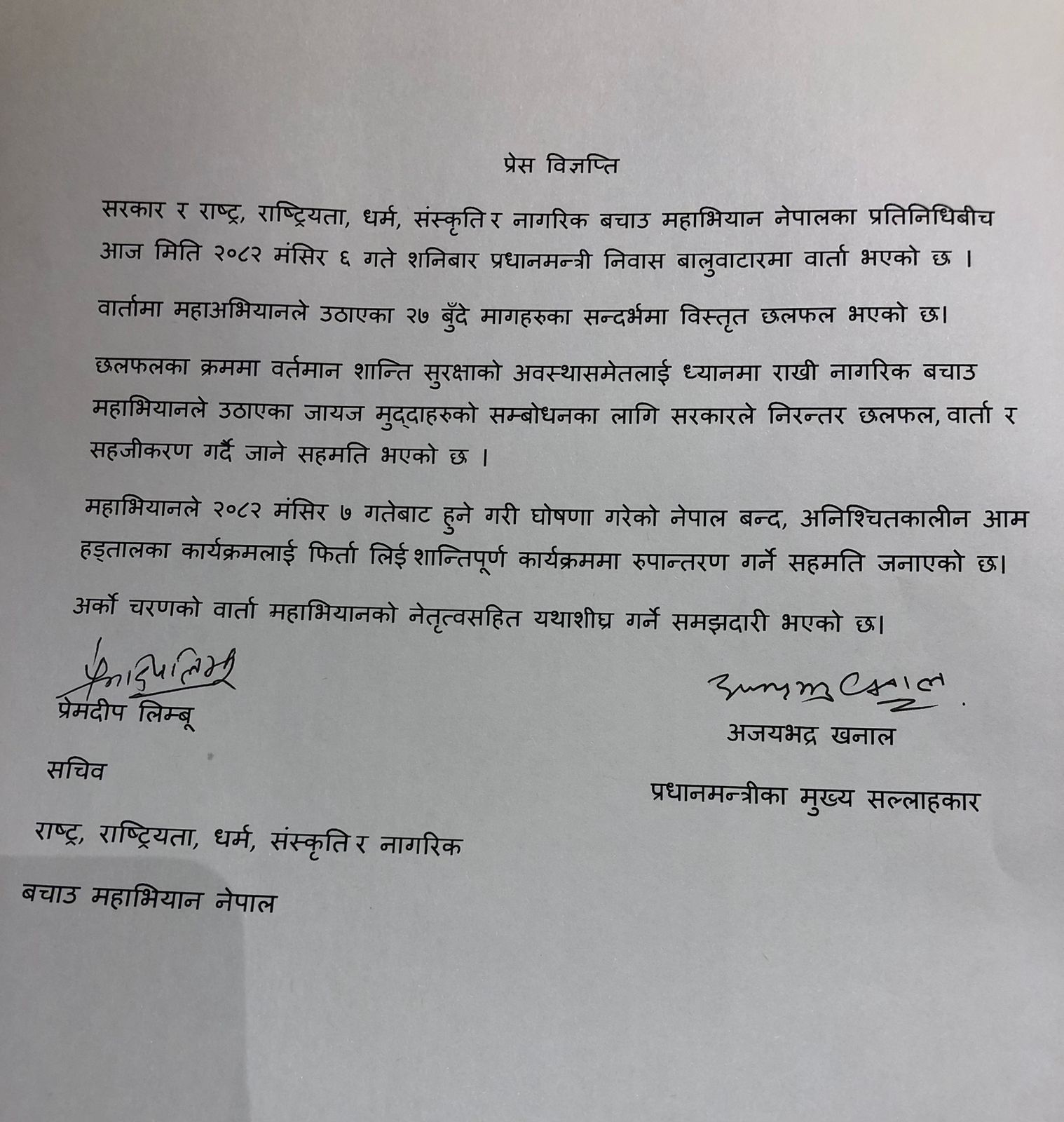 आज बालुवाटारमा सरकार र नागरिक बचाउ महाअभियानबीच भएको विस्तृत वार्तापछि महाअभियानले आइतबारका लागि घोषणा गरेको नेपाल बन्द र अनिश्चितकालीन आम हड्ताल फिर्ता लिएको छ।