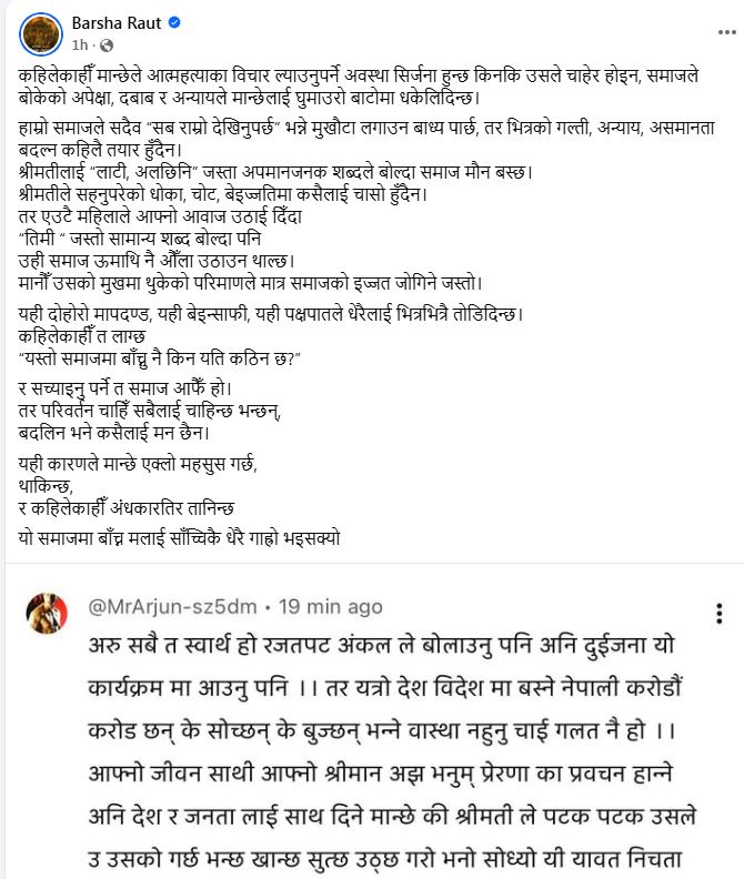 उनले थपेकी छन्, महिलामाथि “लाटी, अल्छिनी” जस्ता अपमानजनक शब्द प्रयोग हुँदा समाज मौन बस्ने तर एउटै महिलाले पीडा व्यक्त गर्दा पनि कठोर आलोचना झेल्नुपरेको अवस्था गम्भीर समस्या हो।