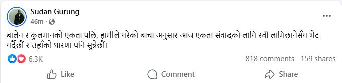 गुरुङले सामाजिक सञ्जालमार्फत लेख्दै बालेन–कुलमान सहकार्यलाई निरन्तरता दिँदै राष्ट्रिय हितका विषयमा सहमतिको दायरा विस्तार गर्न रवी लामिछानेसँग छलफल गर्न लागिएको स्पष्ट पारेका छन्।