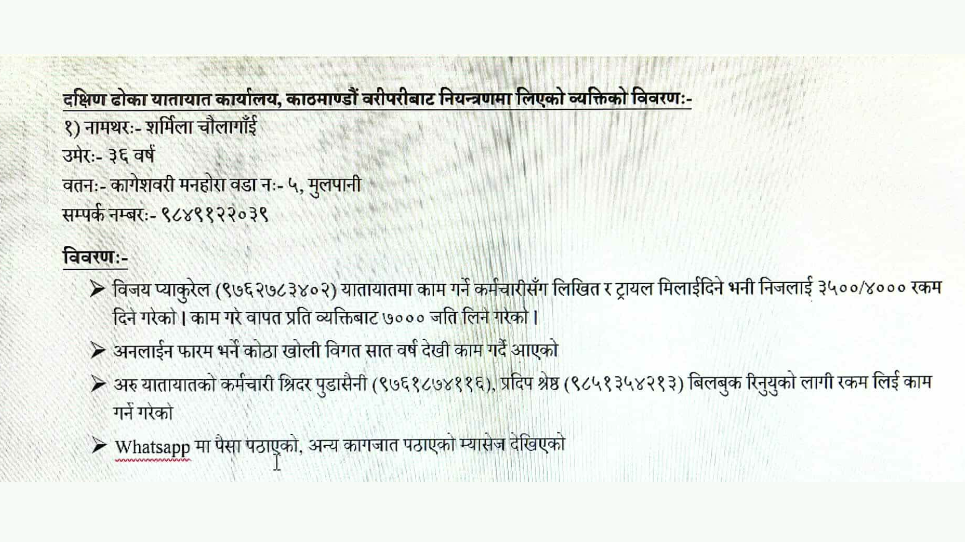 स्रोतका अनुसार कागेश्वरी मनोहरा नगरपालिका–५, मूलपानी बस्दै आएकी ३६ वर्षीया चौलागाईंले यातायात कार्यालयमा कार्यरत कर्मचारीसँग दोस्ती छ भन्दै प्रतिव्यक्ति ७ हजार रुपैयाँ लिने गरेकी थिइन् । चौलागाईंले सात वर्षदेखि अनलाइन फारम भर्ने अफिस सञ्चालन गर्दै आएको र सोही आवरणमा ठगी धन्दा चलाएको प्रारम्भिक अनुसन्धानबाट खुलेको छ ।