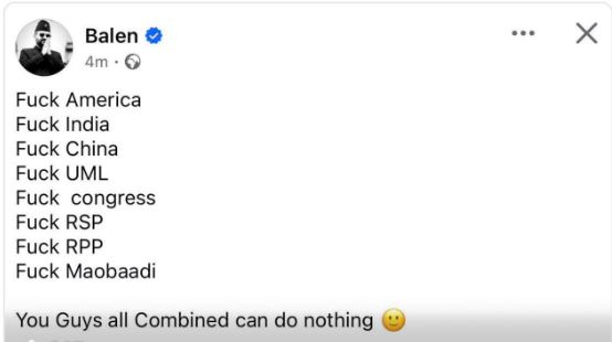 स्टाटसमा उनले अमेरिका, भारत, चीन जस्ता महाशक्तिहरूको नाम लिएर कठोर शब्द प्रयोग गरे । साथै उनले एमाले, काँग्रेस, माओवादी, रास्वपा, राप्रपा सबै दललाई एकै पटक गालीमिश्रित सन्देश पठाए ।